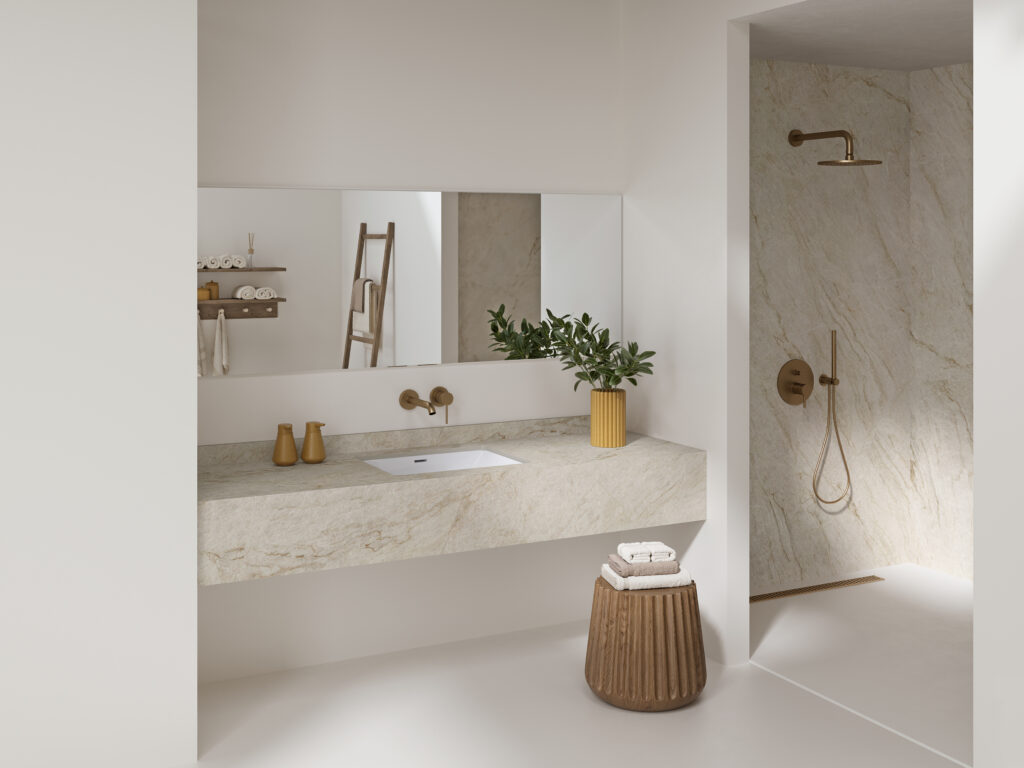 One of our favourite materials for this kind of transformation is Taj Mahal by Neolith. This remarkable surface takes inspiration from the natural beauty of quartzite, combining warmth and refinement with the performance of cutting-edge sintered stone. The colour features a creamy beige base with delicate, flowing veins of gold and soft grey — tones that feel both luxurious and timeless. Taj Mahal is ideal for those who love a modern aesthetic that still feels inviting and organic. It pairs beautifully with white cabinetry for a fresh, light look or with darker joinery for a striking contrast.